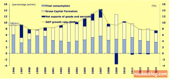 中国经济属于出口导向型经济也是个过时观念。在全球金融危机爆发之前的十年间,中国GDP平均增长率为10%,净出口(出口额减去进口额)对增长的贡献仅约为1个百分点。过去三年,每年的净出口其实对GDP增长产生了负面拖累。