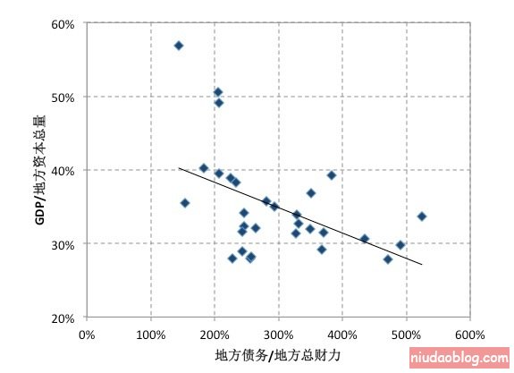 先从下面这幅图说起。这是我和中信并购基金研究部总监朱元德博士最近关于地方政府金融所做的一系列研究中最直观也最重要的一个发现。我们以省为单位,用地方债务与地方总财力的比例来衡量地方债务的水平;用GDP与地方资本总量(根据该省过去三十年固定资产投资按平均折旧率水平求出)的比例来衡量地方经济效率,该指标类似企业的投资资本收益率。如图一所示,地方债务水平与地方经济效率之间存在显著的负相关关系,即,经济发展效率较高的省份债务水平相对较低,债务管理能力较强。需要特别指出的是,地方政府债务水平与地方经济发展效率之间这种负相关关系,是我们理解和设计地方政府金融体系的关键出发点。