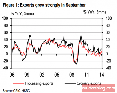 此外,中国出口回暖与9月各项与出口活动相关的调查数据不一致。官方的制造业采购经理人指数(PMI)显示,9月份新出口订单分类指数徘徊在50点左右,这表明受访者预期增长乏力。