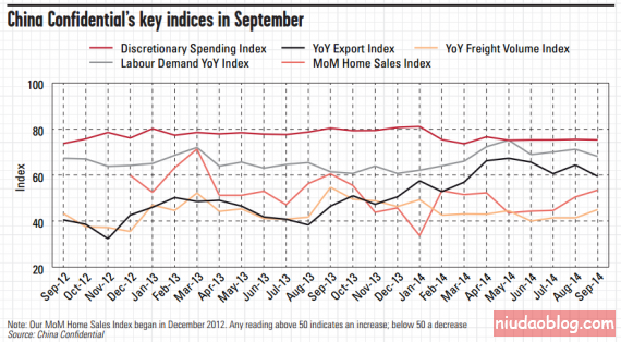 在这些经济学家发布预测之前,已有多个迹象显示9月份增长低迷。《中国投资参考》编制的可支配支出指数、企业用工需求、出口增长和货运量等一系列指标在当月不是下降,就是保持低迷(见下图)。