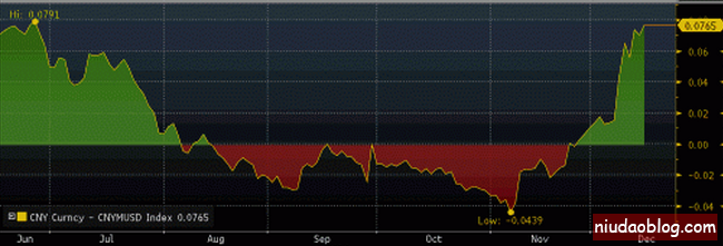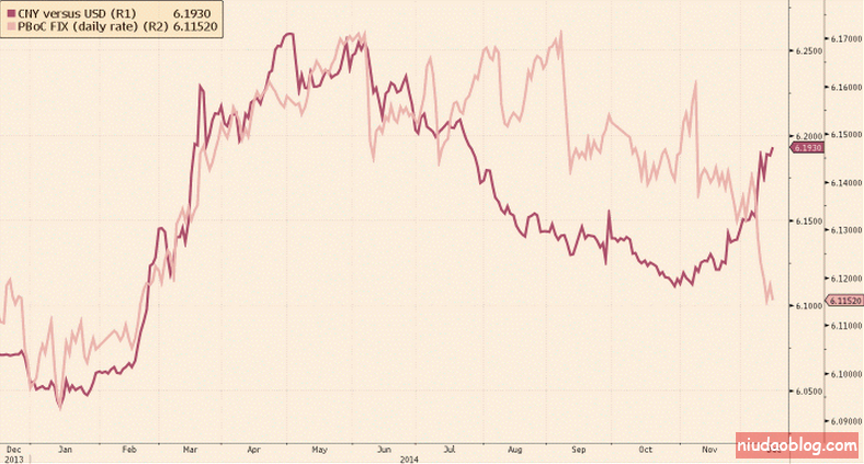 自2005年与美元挂钩以来,人民币汇率交易价格一直高于央行设定的中间价,这表明,中间价在抑制推升人民币汇率的市场压力。如今情况已变。随着美元兑多数竞争对手货币飙升(新兴市场货币汇率上周创下14年最低)以及在中国发布11月明显疲弱数据以后,投资者一直在推低人民币汇率。中国消费者物价指数(CPI)降至5年低点,进口额同比下滑6.7%。上月,中国两年来首次下调基准利率,这也是一个原因。
