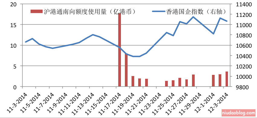 沪港通运行第一个月交易额整体的确低于市场预期,尤其是南向投资,如图1和图2所示,我们发现北向的资金(截至到12月3日,累积买入519亿元)远远多于南向(截至到12月3日,累积买入51亿元)。北向投资低于预期的主要由于技术问题(比如清算交割)和投资范围,一些全球大型公募难以立即交易A股,而沪港通开通前,内地投资者提前买入,也使受益股处于高位,可能阻碍部分北向资金在初期买入。南向交易低于预期主要香港市场运行与内地投资风格不相符,使内地投资者对南下投资兴趣不高;同时机构投资者受产品合约的限制无法直接投资H股;还有只有净资产在50万人民币以上的账户才可以南下投资,都一定程度上限制了南下的资金流量。南下的交易过程产生中产生6%的外汇兑换成本也极大的影响投资热情。