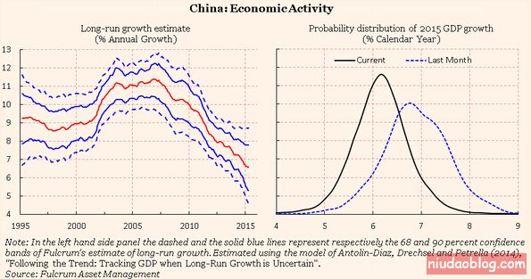 如下面的图表所示,该模型的2015年GDP增长概率分布已经明显下移,增长率低于6%(中文语境中对经济硬着陆的一个定义)这一结果出现的统计风险大大增加。