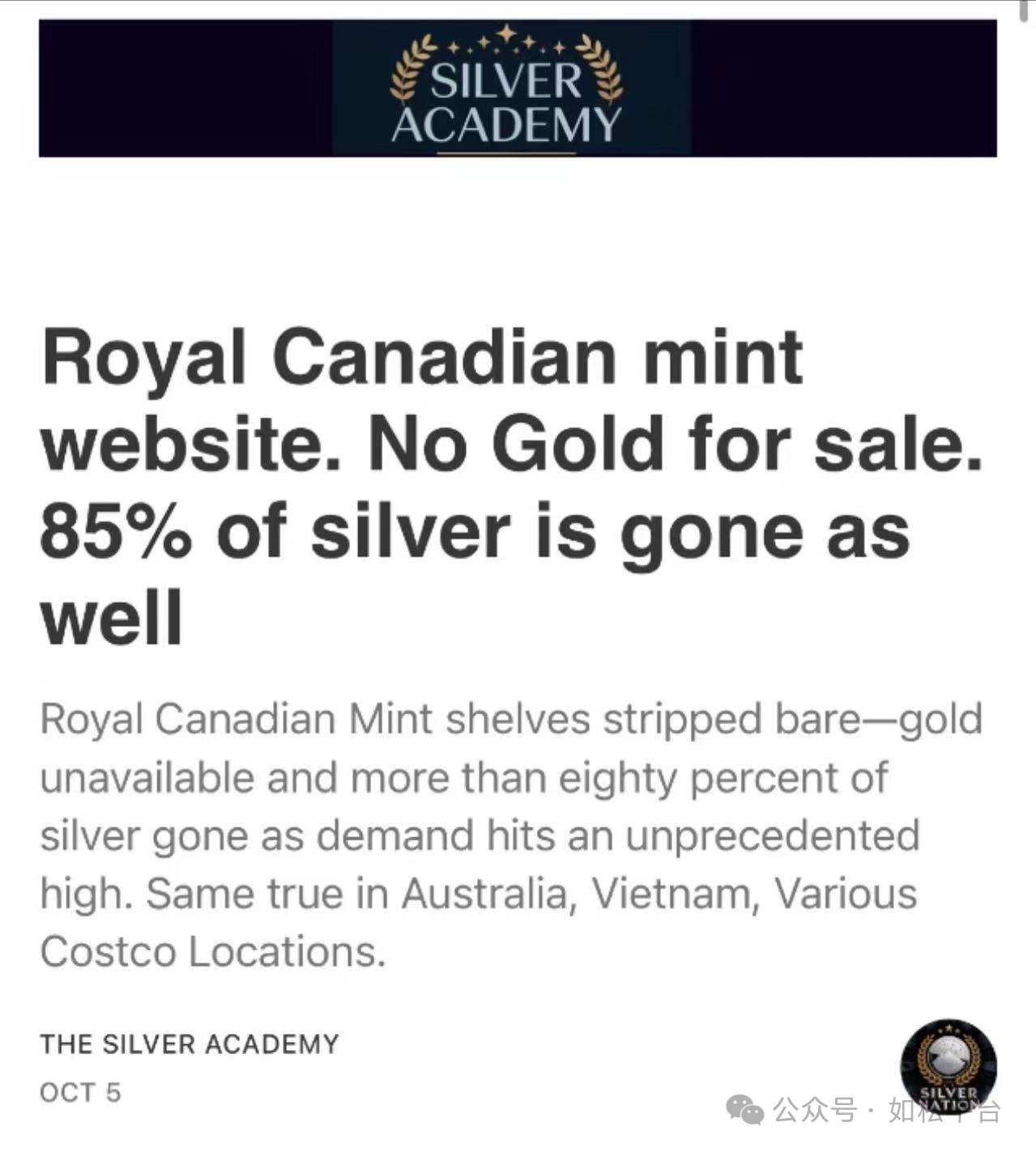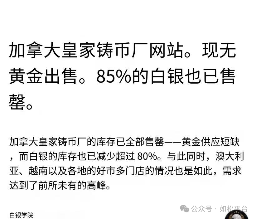 加拿大铸币局网站上明确说到,黄金供应短缺,而白银库存也已经减少超过80%。在世界各地开业的好市多超市都有黄金和白银的零售业务,但根据加拿大铸币局网站的消息,澳大利亚、越南等地的好市多门店出现了黄金白银实物短缺。这些信息说明实物黄金白银市场的流动性已经收紧甚至趋于枯竭。