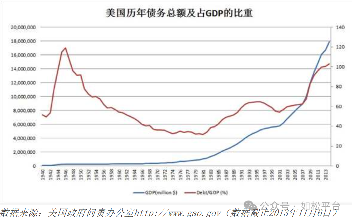 下图红线是1940年至2013年美国政府负债率走势图。2013年以后的美国政府负债率继续上升,现在已经超过战后的高点118%达到约124%,这是尽人皆知的事情。