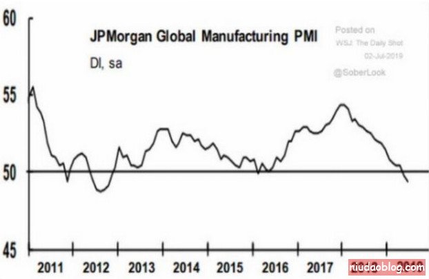 6月份的摩根大通全球制造业PMI指数(下图)录得49.4,跌至6年半以来最低,弱于5月前值49.8,也是2012年下半年以来首次连续两个月不足50荣枯线。