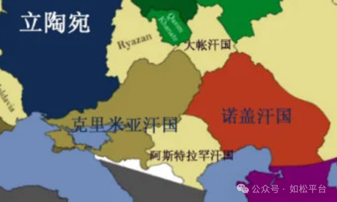 金帐汗国的实际建立者拔都把汗国分成13部分,而阿斯特拉罕汗国就是其中之一,见下图,它位于克里米亚汗国与里海之间,是一个较小的汗国。第一次俄土战争的结局是俄罗斯获胜,阿斯特拉罕汗国从此纳入了沙俄的版图。