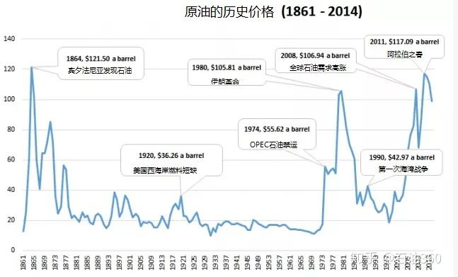 下图是国际金价历史走势图,目前已经在每盎司5100美元附近,下下图则是国际油价至2014年的走势图,2014年年中国际油价出现了跳水,然后在低位震荡,虽然在2020年至2022年3月间出现一轮冲高走势,美油高点在每桶130美元附近,但并未改变自2008年之后的震荡格局,源于2008年每桶147美元的最高点还在。目前美油在每桶八十多美元附近徘徊。虽然这两张图画的比较潦草,尤其是2008年至2014年间的原油价格图形并不十分准确,但不妨碍我们说事。