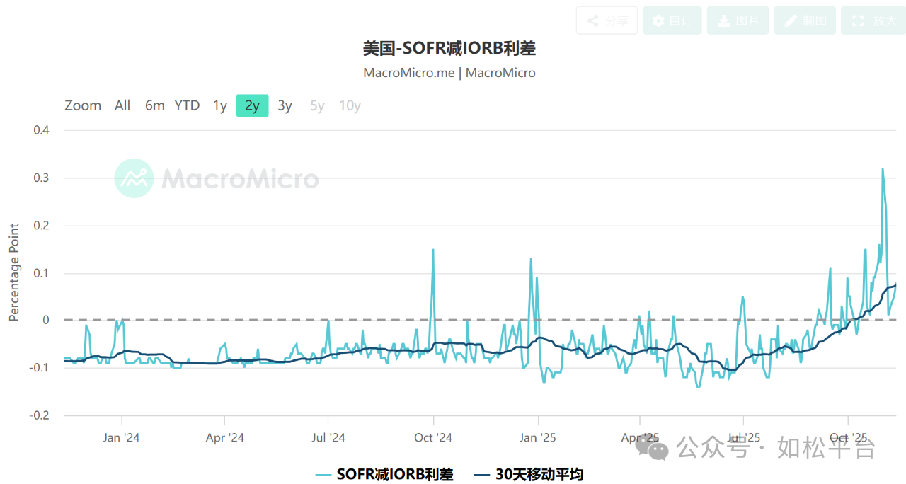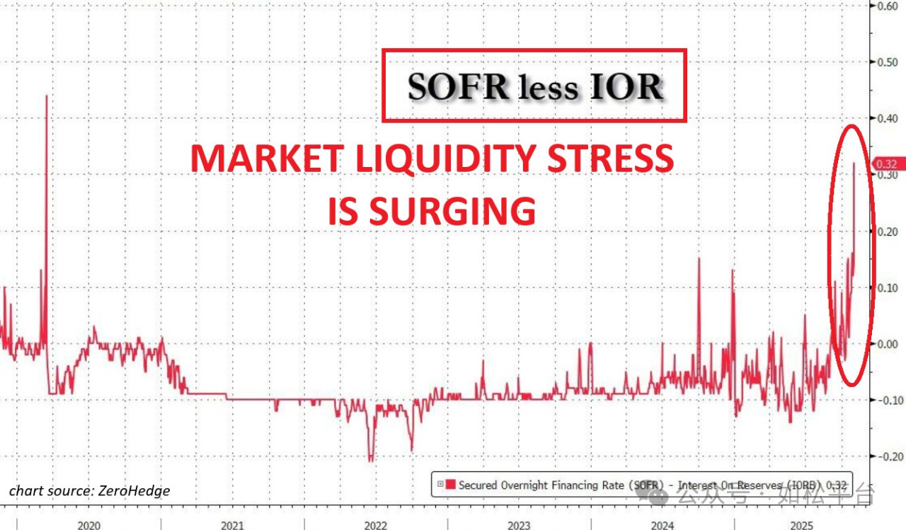或有朋友说,现在的利率急升与政府停摆有关,肯定有一定的关系,但并不是最主要的,下图是SOFR-IORB利差走势图,在过去两年的时间内在稳步上升,现在,30天的移动平均数据一直在零轴的上方,这是流动性趋于枯竭的标志,如果美联储持续缩表,等待美联储的就是债务爆破。
