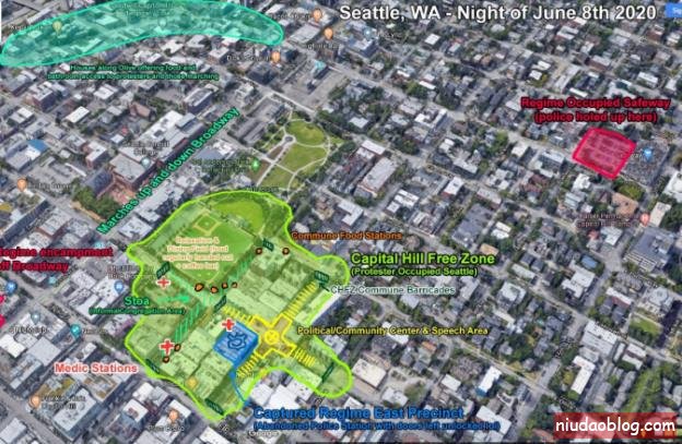 最近,美国西雅图市发生了一件震惊世界的大事,部分人攻占了警察局和市政厅成立了西雅图人民公社,下图是西雅图人民公社的地盘: