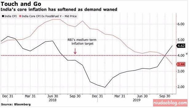 2019年8至11月,印度的通胀率分别为3.28%、3.99%、4.62%、5.54%,正呈现加速之势,也已经远超过印度央行设定的4%的中期通胀目标。