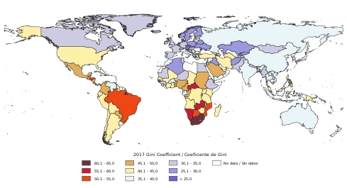 第一,从下面的贫富差距地图上可以看到,发达国家的贫富差距比较小,而新兴市场国家的贫富差距比较大。