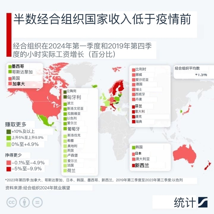 劳动者的名义工资增速受到压制但通胀来到更高的水平,就导致一个严重的结果,劳动者的实际收入开始下降,下图显示,由36个国家组成的经合组织中有一半国家的家庭实际收入低于疫情之前,这其中就包括了美国、德国、日本、意大利、加拿大等经济体,恰恰是这些国家的终端需求组成了全球经济中最主要的需求终端。