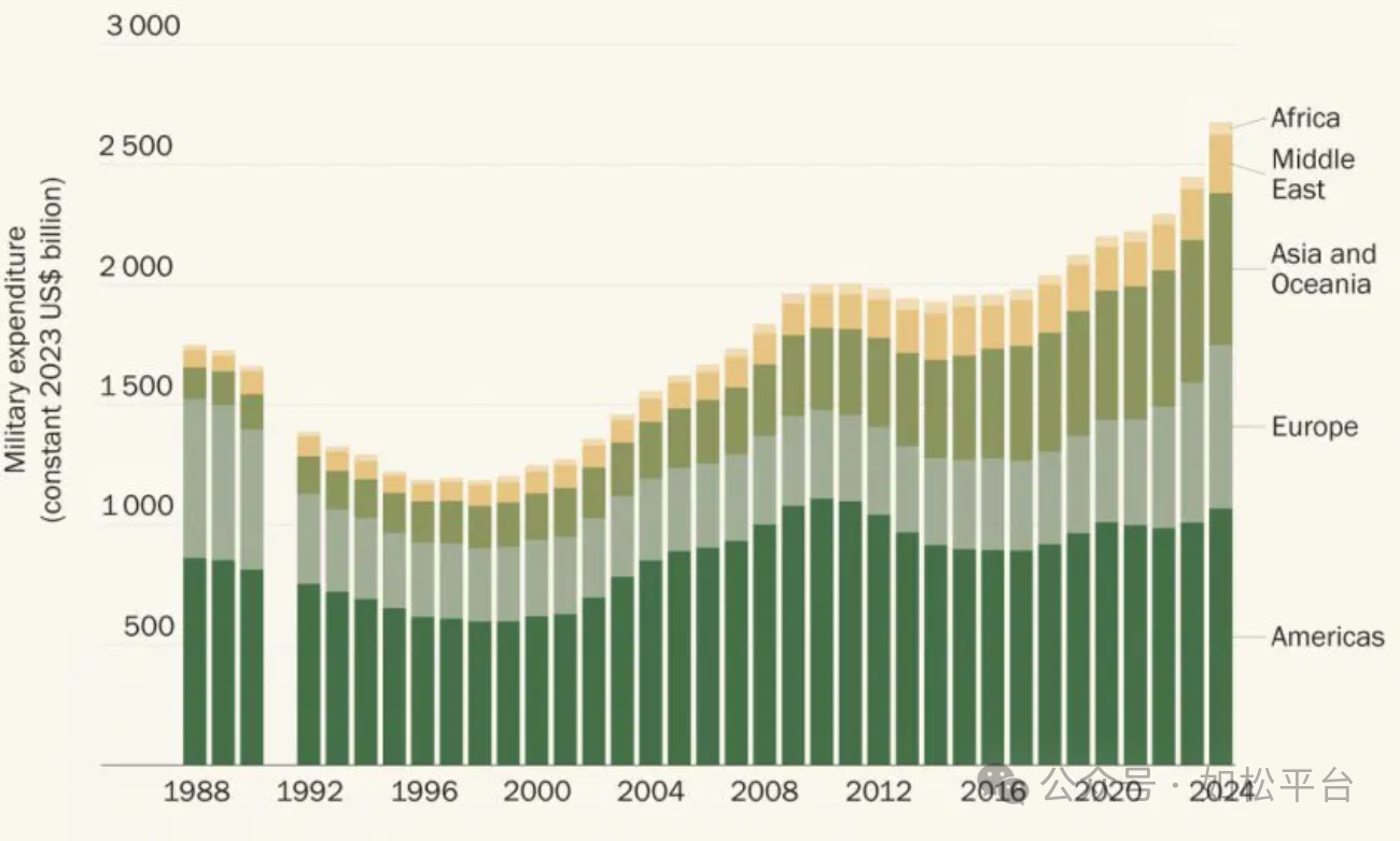 次贷危机之后基于美国债务和财政压力,美国只能压缩军费支出进而导致全球军费支出的短暂下降,从2015年前后开始亚太地区的军费支出快速上涨主导推动了全球军费支出的再次上升。从2022年俄乌战争爆发之后全球军费支出的速度开始飙升,2024年全球军费支出比上年增长约9.4%,这个增速是全球经济增速的3.8倍,在图中表现的非常清楚。