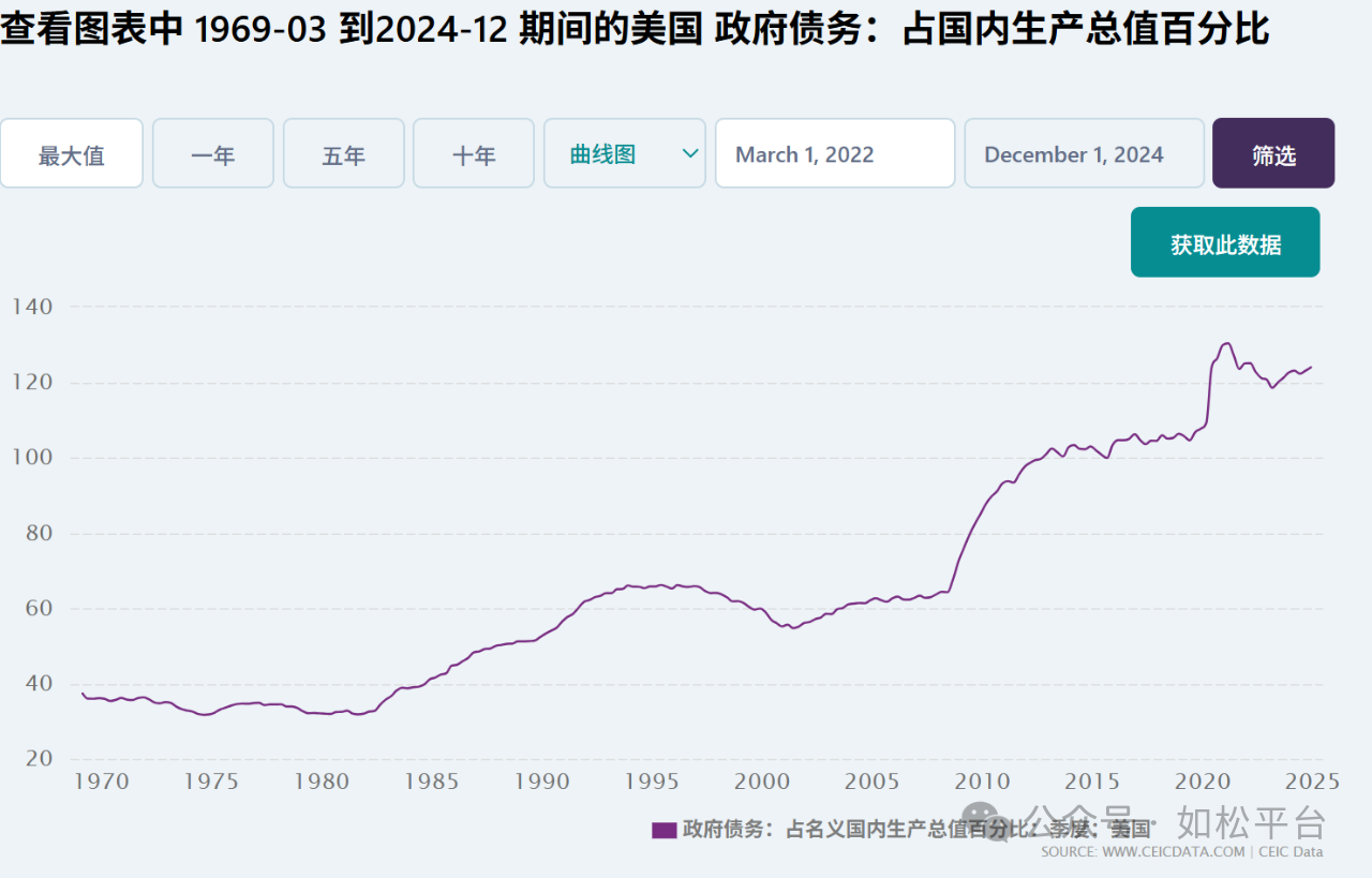 经过七十年代的高通胀之后,美国开始使用美债为担保来发行美元,通过美债投资为海外美元提供回流渠道并为海外美元赋予价值,作为美国主权货币的美元纸币继续承担世界储备货币的职责。从上图可见,虽然美元的发行方式改变了,但美国产业不断外迁、贸易逆差不断扩大的趋势并未改变,只相当于美国通过增加借贷维持美元的世界储备货币地位,进而维持更高的生产要素价格、传统的经济模式和生活模式以及美国在全球的霸权地位。这就导致贸易逆差的继续扩大和政府债务率的不断上升,现在美国政府的负债率已经上升到124%以上,参考下面的两张图。