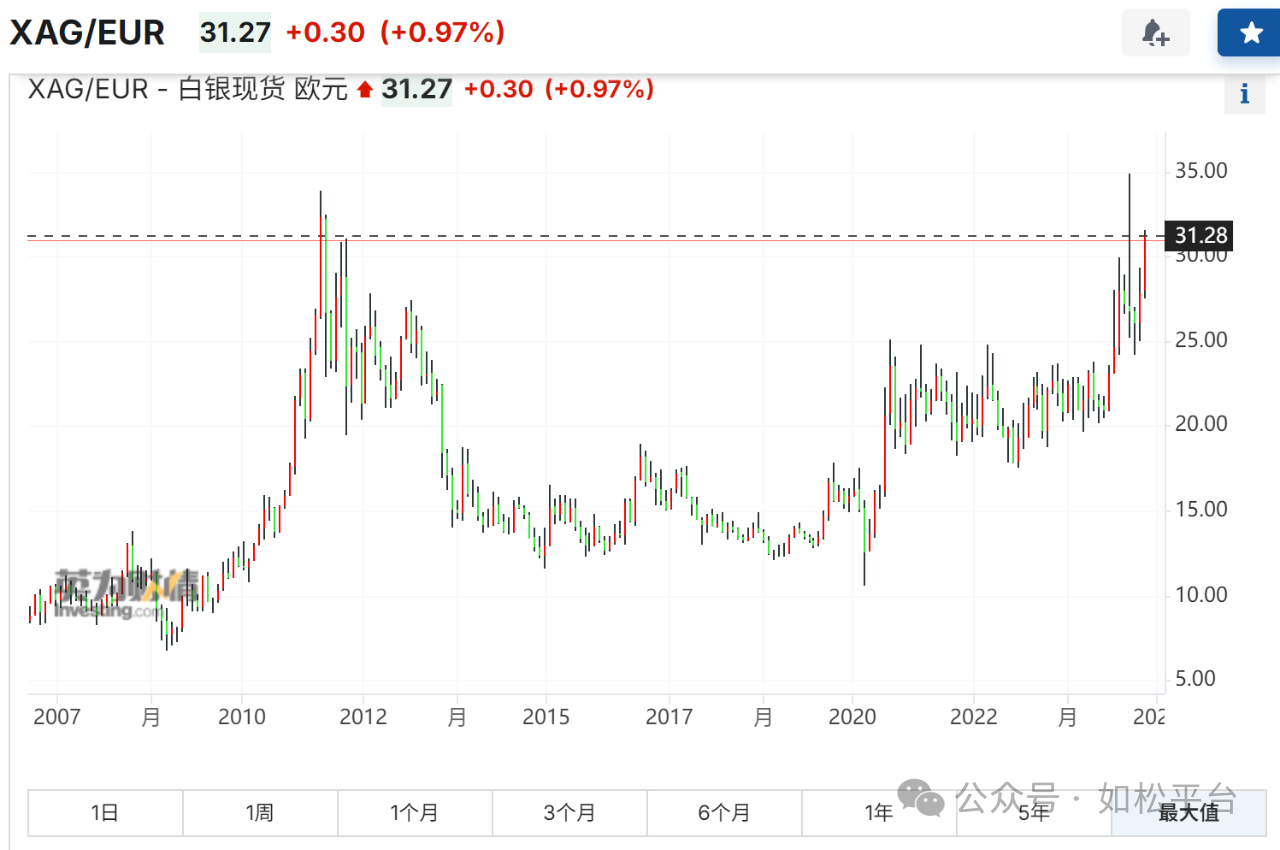 2011年欧元白银价格最高达到了每盎司33.85欧元,现在的价格是每盎司31.27欧元,欧洲白银价格已经走出了一个大大的圆弧底,距离2011年的高点还有7.6%的距离。