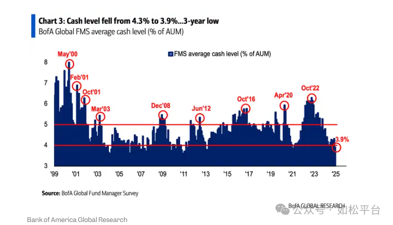 这当然是市场狂热的结果,现在的美股市场上充斥着美股不败尤其是前十大市值科技股永不败的神话,投资者疯狂追逐AI类股票,正是这种疯狂追逐让投资人的现金持有量跌至创纪录的低位。