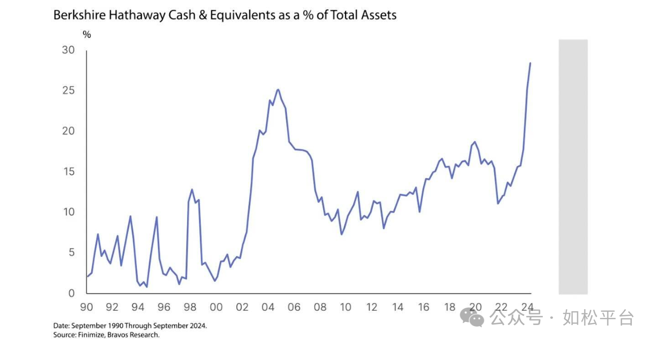 与上述情形完全相反,巴菲特却已经连续十几个季度减持股票,到今年二季度末,巴菲特的现金持有量高达3441亿美元,很多国家的央行很可能都没有巴菲特这么多的现金,巴菲特现金持有量与伯克希尔总资产之比来到了创纪录的高位,参见下图。
