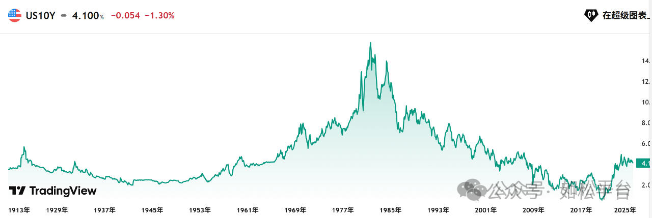 还是让我们看看这张自美联储成立以来美国十年期国债收益率的走势图: