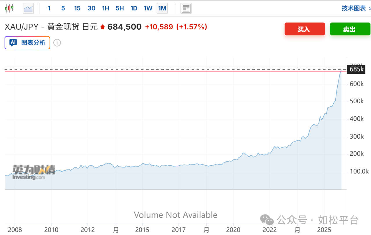 既然日本只能进行蜗牛式、缓慢的跟随式加息,就不可能实现实际正利率,实际负利率就会不断刺激日元贬值和金价上涨,下图是日本金价近年来的走势图,完全是一副疯牛走势,还看不见放缓脚步的迹象。