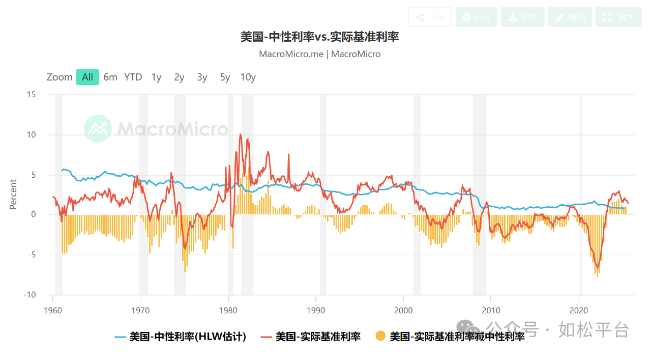 上图是美国中性利率和实际基准利率走势图,实际基准利率的含义是名义利率减去通胀率。从图中可见,到今年8月美国名义利率减去通胀率得到的实际基准利率是1.29%。图中给出的中性利率是0.84%,以中性利率不变来计算,最新公布的11月通胀率与8月持平,8月之后美国的名义利率又下降了0.5个百分点,这意味着目前美国的实际利率就是1.29%-0.84%-0.5%=-0.05%,这意味着美国也已经进入实际负利率区间。