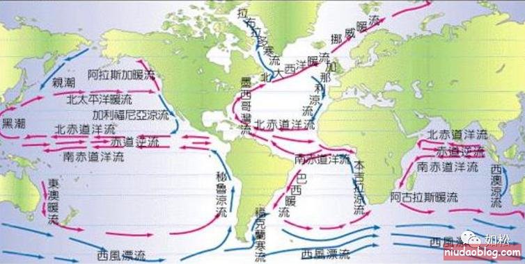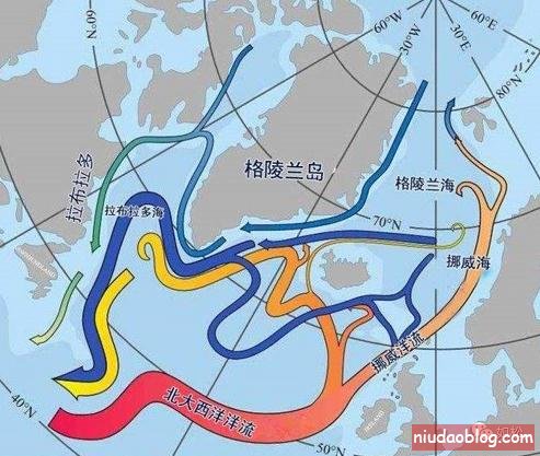 我以前在博客上写过关于大洋洋流的文章,以大西洋来说明洋流的形成机制:挪威附近海域因为气温低,海水中含有更高浓度的盐分,这些高质量的海水不断下沉,在海底形成更重质量的海水;可在墨西哥湾,海水温度高,海底海水的质量轻,这就在挪威海和墨西哥湾的海底形成了海水的质量梯度,挪威海的深海海水顺着海底向墨西哥湾流动,到了墨西哥湾之后,随着温度上升,质量变轻,深海海水浮上海面;海面的海水在季风的推动下,由墨西哥湾向欧洲流动,给欧洲带去了暖湿气流(这就是北大西洋洋流或暖流),让欧洲的气候宜人。