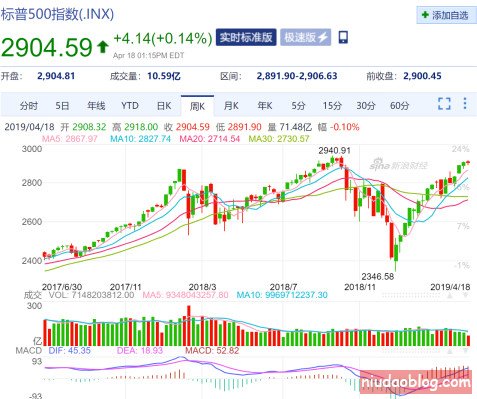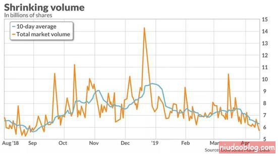 ▲上图是美股10天移动平均成交量走势图(蓝线),下图是标准普尔周K线走势。虽然股指再次回到了最高位附近,但成交却出现了剧烈的萎缩。