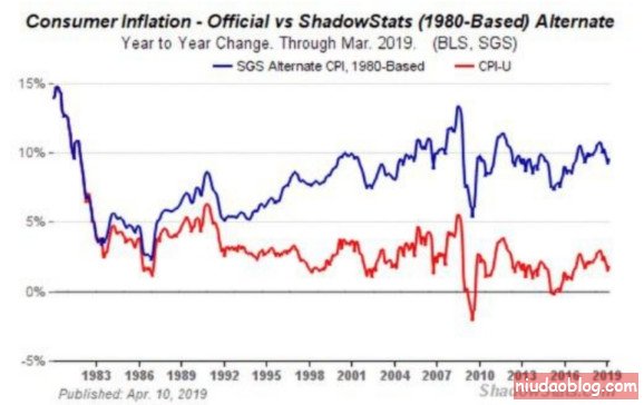 影子政府统计机构经营者约翰·威廉姆斯(John Williams)说,美国的CPI公式多年来一直在改变,目的是为了低估通货膨胀率。如果采用1980年的CPI公式测算,可以看到年通货膨胀率大约在10%左右(下图蓝线),而非现在的2%(红线):